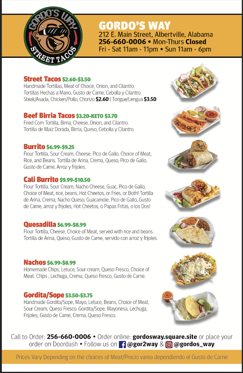 Gordo's Way Menu
